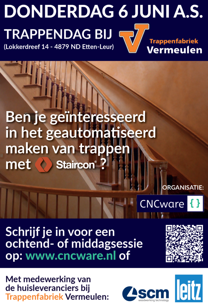Wil je meer weten over het tekenen van trappen in een 3D-omgeving met daarbij de mogelijkheid om volautomatisch een CNC-machine aan te sturen. Zet dan een uitroepteken op donderdag 6 juni 2024 in je agenda. Het nog jonge bedrijf CNCware, in Nederland exclusief dealer van het softwarepakket Staircon (en ook Archimede en SmartCabinet), nodigt je (bij inschrijving) uit bij Trappenfabriek Vermeulen te Etten-Leur.